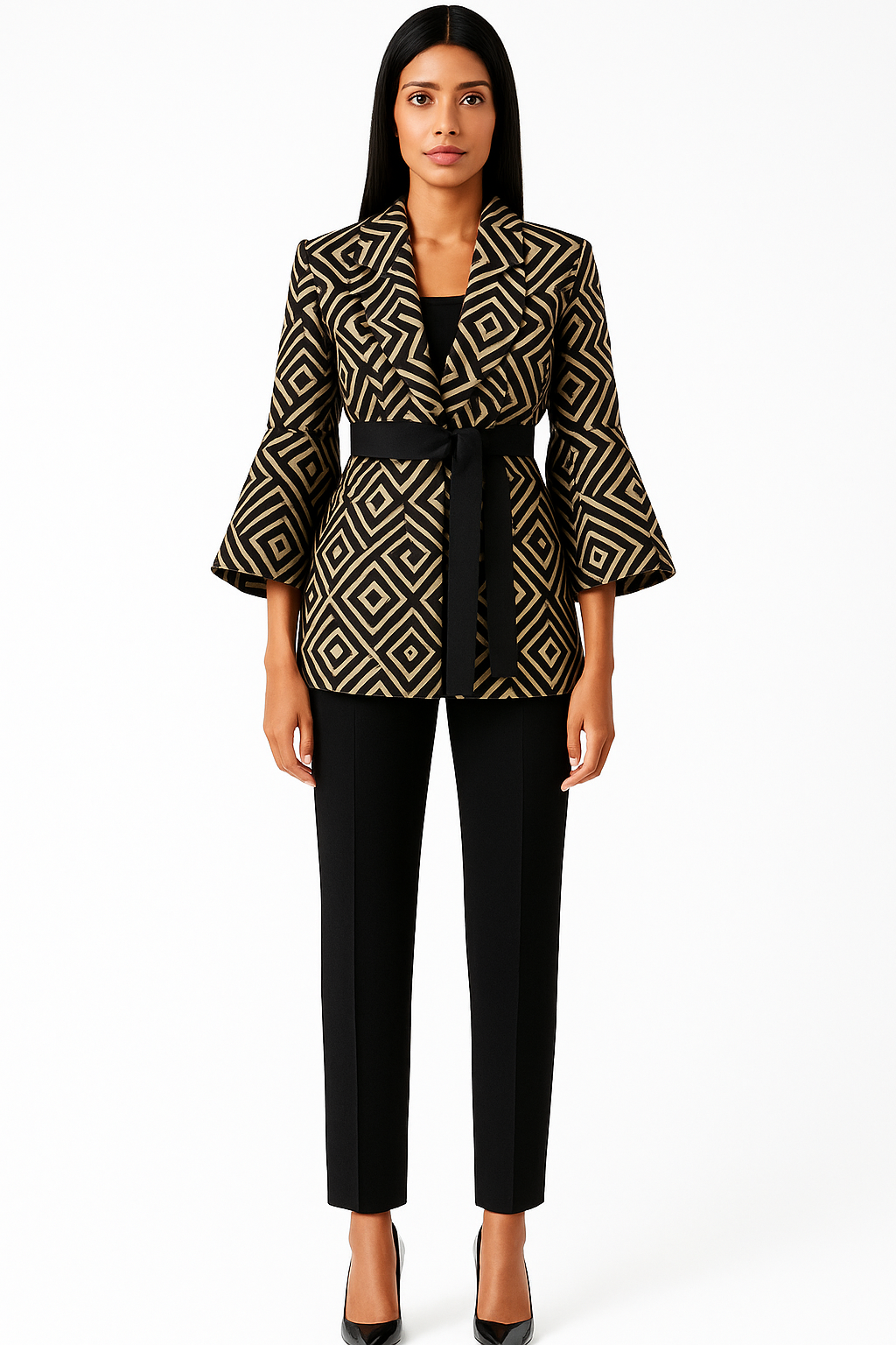 This striking blazer commands attention with its sophisticated bell sleeves and a figure-defining tie waist. It features a bold geometric pattern in black and gold, making it a perfect fusion of contemporary style and classic elegance. Paired with sleek black trousers, this ensemble is ideal for professional settings or stylish events.