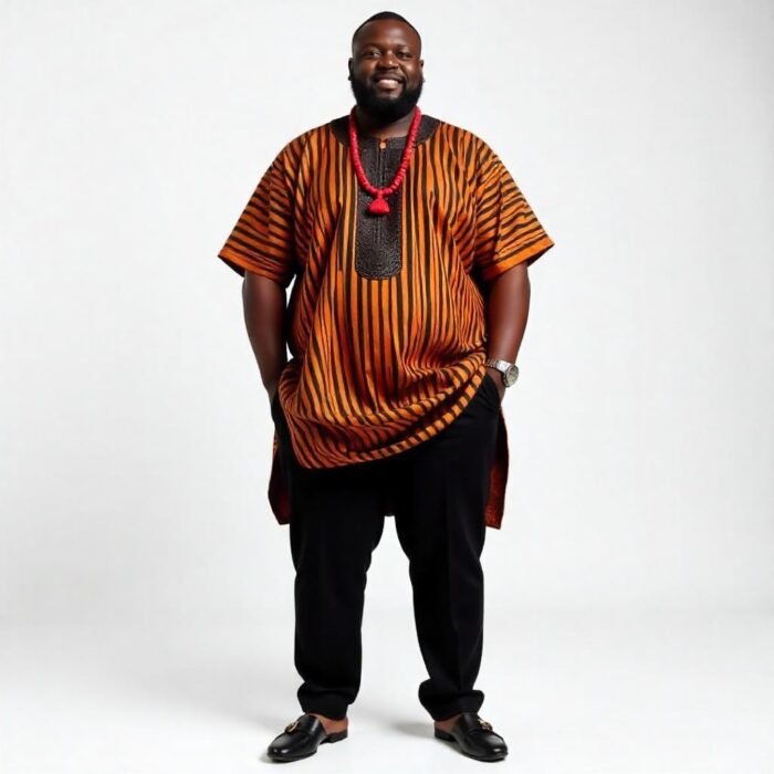 Vibrant and comfortable dashiki top featuring bold orange and black vertical stripes with intricate black embroidery around the neckline. This traditional yet contemporary piece offers a relaxed fit and short sleeves, making it ideal for various occasions. Perfect for adding a culturally rich and stylish touch to casual wear, or dressing up for events when paired with smart trousers.