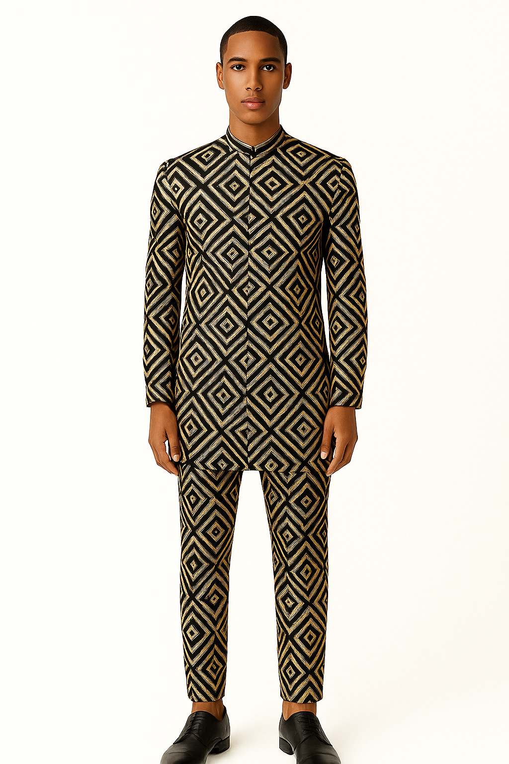 This striking suit features a bold, head-to-toe geometric pattern in black and gold. The jacket is a slim-fit blazer with a mandarin collar, and the matching trousers are also cut for a modern, tailored fit. This two-piece set is a sophisticated statement piece perfect for special occasions or formal events where you want to stand out.