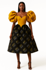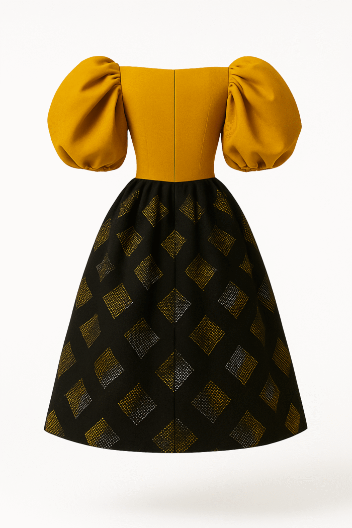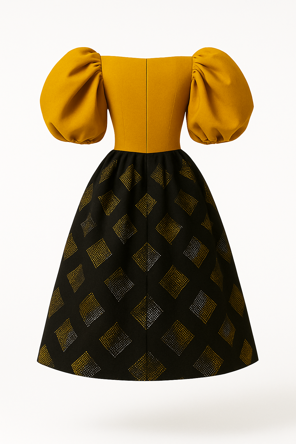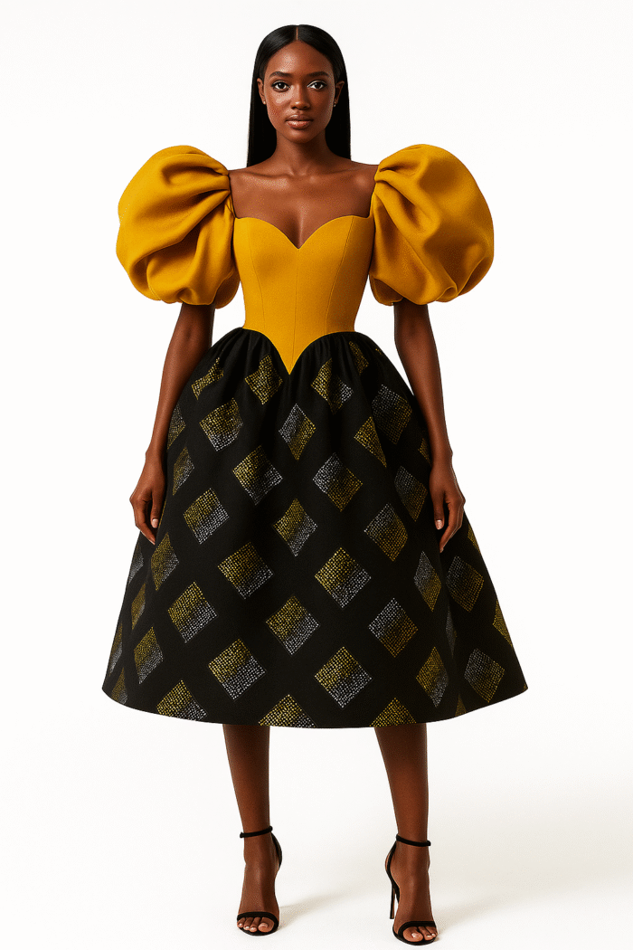 Make a grand entrance in the Kaima Midi Dress, a true masterpiece from Chi and Stainless Fashion. This dress features a striking silhouette with a fitted, strapless yellow bodice and a dramatic pair of oversized, ruffled sleeves. The full, midi-length skirt is crafted from a rich fabric with a shimmering metallic diamond pattern in gold and silver set against a black background. This elegant dress is perfect for making a bold statement at any special event.