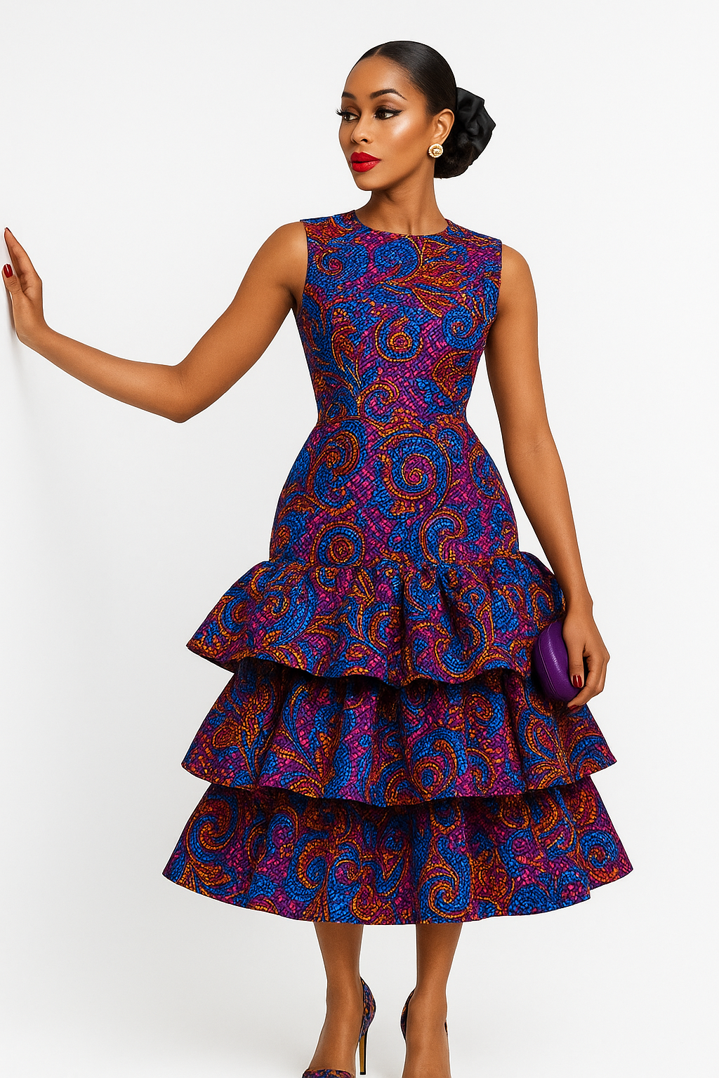The Mojisola A-line Dress is a masterpiece of timeless design and intricate detail. This sleeveless midi dress features a classic V-neck bodice that flows into a tiered, A-line skirt with a playful ruffled accent. The fabric showcases a beautiful pattern of interlocking diamonds and dots in varying shades of deep blue. A delicate, sculpted fabric flower on the shoulder adds a final touch of sophistication, making this dress perfect for any special occasion.