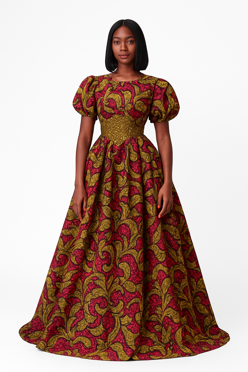 Make a vibrant statement in the Simisola Peplum dress. This chic ensemble features a peplum top with a bold geometric pattern in shades of orange, yellow, and blue. The top is perfectly complemented by a pair of high-waisted, gathered dress adorned with a coordinating striped pattern. The combination of different prints in a matching color palette creates a unique and modern silhouette, perfect for making a stylish impression.